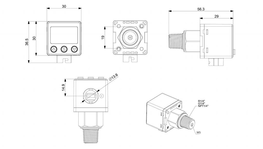 压力接口 | 外螺纹R1/4、NPT1/4、G1/4可选,内螺纹M5 | |||