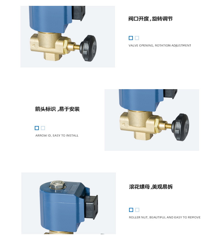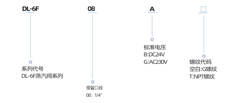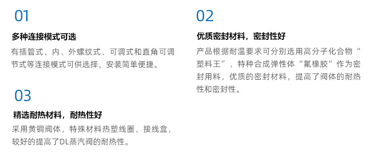 DL-6F型二位二通直动式高温蒸汽电磁阀,可独立安装在熨烫设备上,电气部分防水性能好,有插管式、内、外螺纹式、可调式和直角可调式。