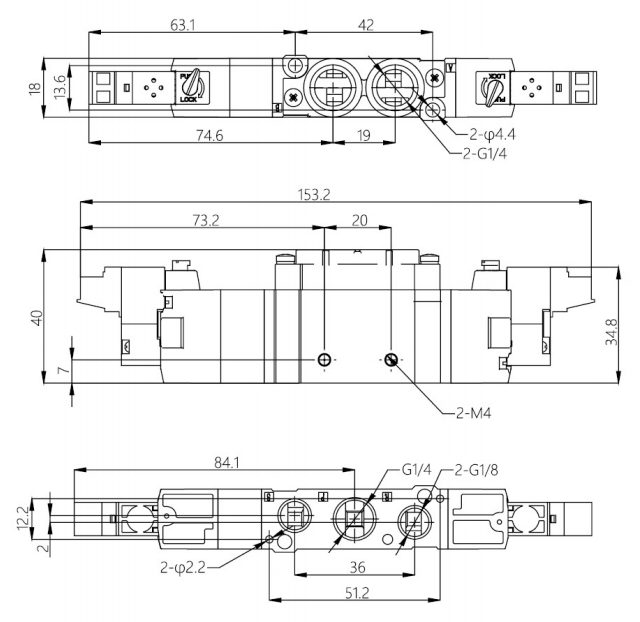 接管口径 | 进气口=工作口=排气口=M5 | 进气口=工作口=排气口=1/8 | 进气口=工作口=1/4 | |